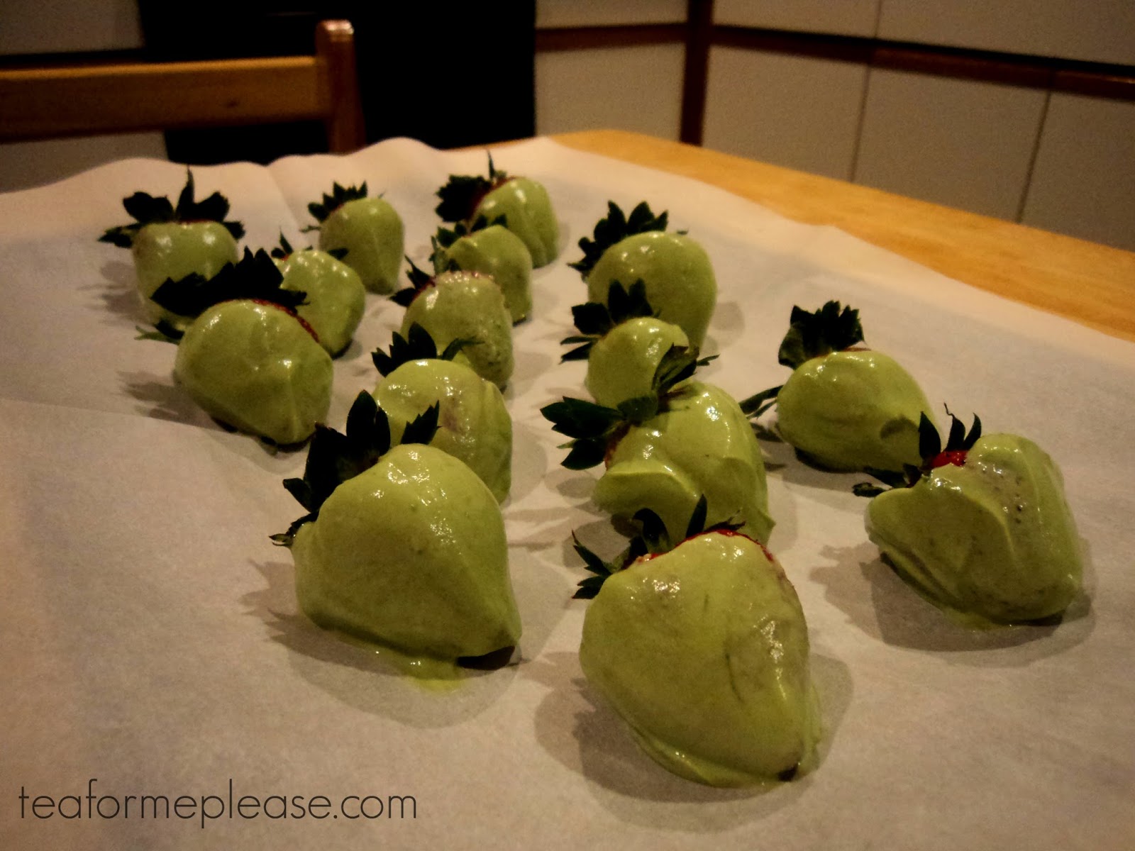 2. Dip strawberries in matcha yogurt, coating evenly. It helps to grasp the leaves as you do this.
